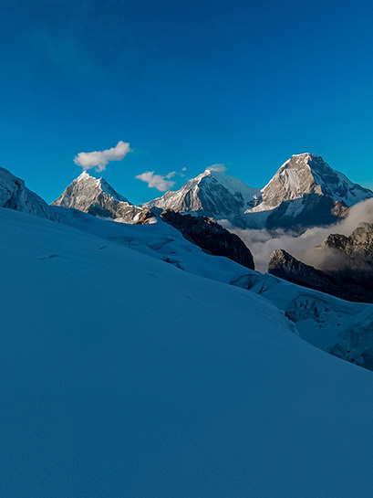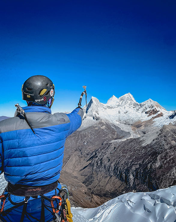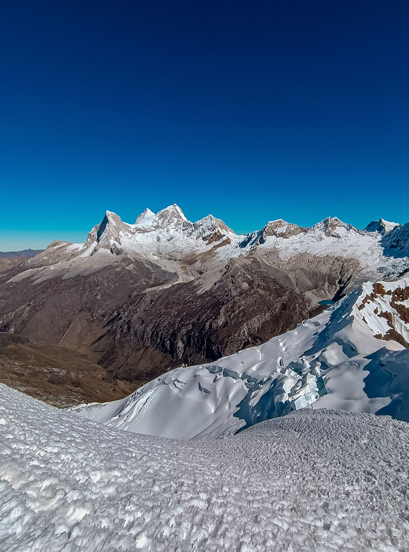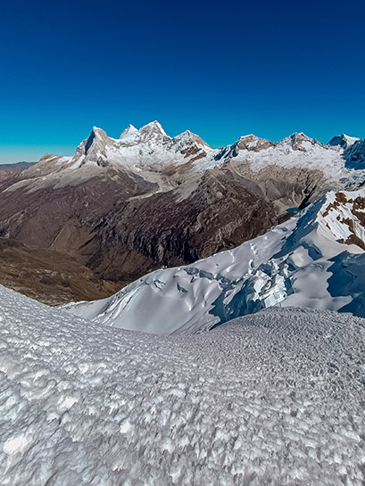 Nos levantaremos en la madrugada alrededor de las 2:00 am, para cambiarnos y empezar el ascenso rumbo al glaciar, una corta y empinada subida en hielo, luego hay un terreno más suave de travesía en el glaciar. Hay campos de grietas para negociar y los últimos 200 metros para llegar a la cumbre son empinados 65 grados. Se requieren alrededor de 3 a 4 rápeles durante el descenso. Las vistas desde la cumbre (5460m) son hermosas, Huascarán, Chopicalqui, los Huandoys, Chacraraju y Pisco que nos rodean. Luego de disfrutar de la cumbre, iniciaremos el descenso rumbo al campo base, donde nos espera el almuerzo, bebidas para hidratarse y poder descansar para el retorno al día siguiente.